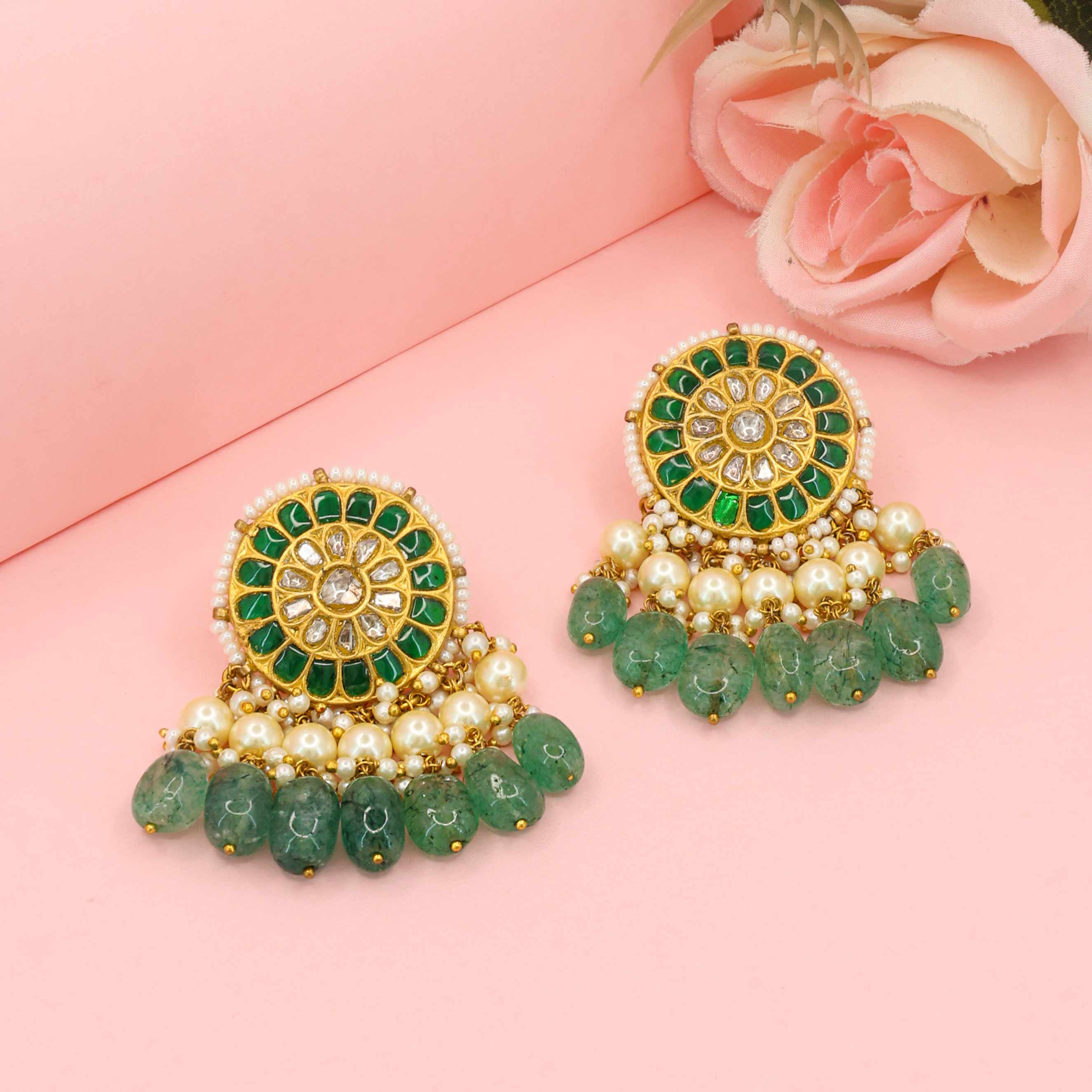 These traditional gold earrings feature a central **Polki diamond** surrounded by intricate green enamel work, resembling a delicate flower. A border of tiny pearls frames the main stud. The bottom is adorned with multiple strands of pearls and strung **green gemstones**, creating a tiered, dangling effect that's both elegant and regal.