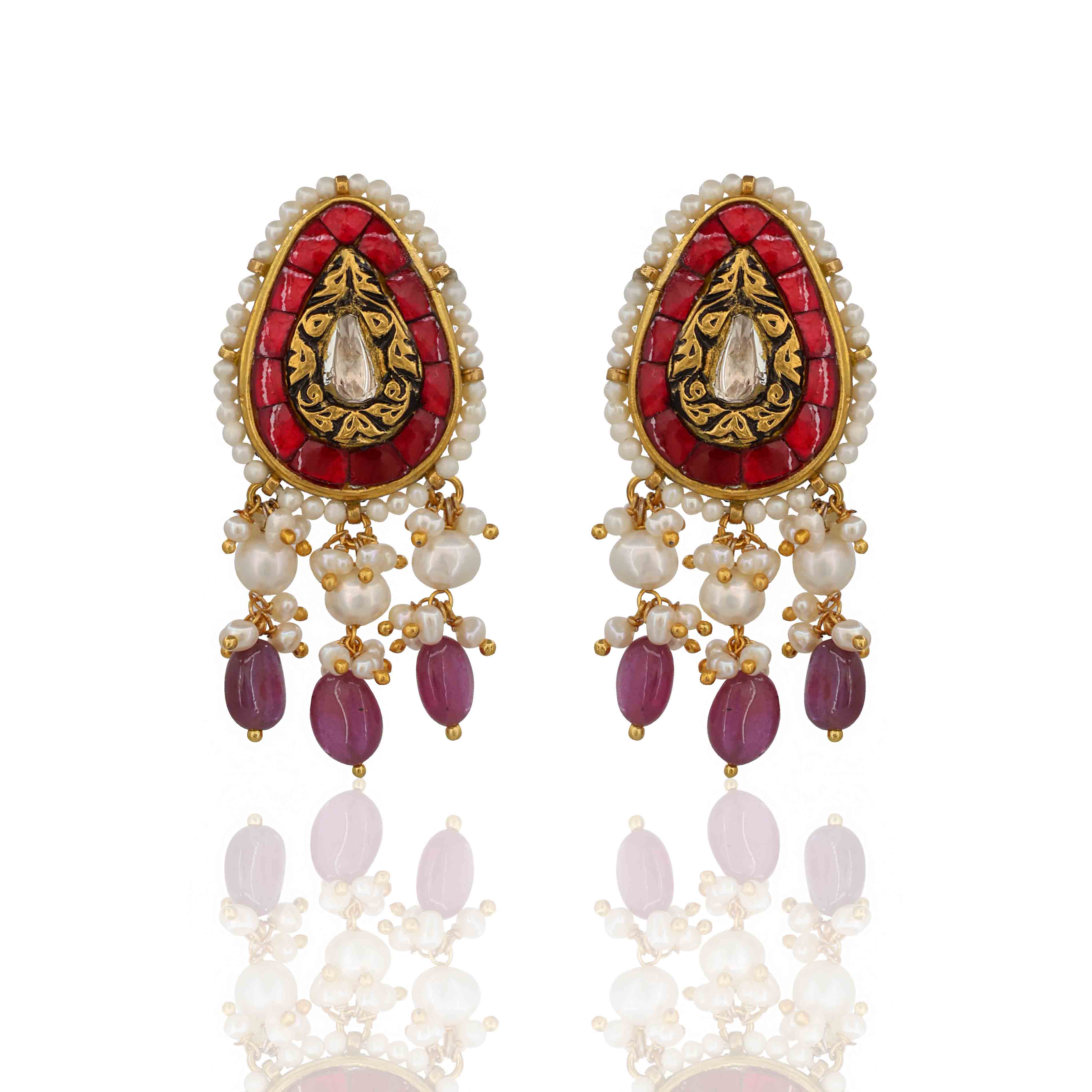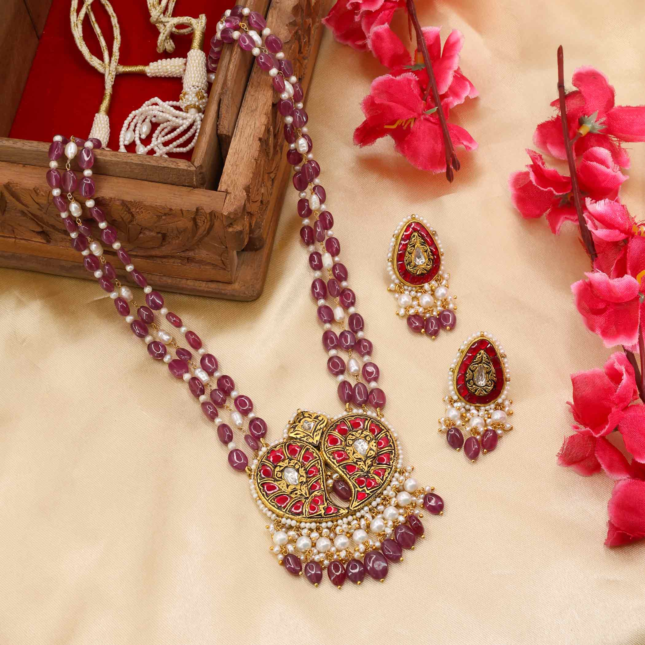 Gold pendant set featuring double Polki Diamondbuta motifs set in deep Ruby Glass Filling. It's elegantly strung with tiered pearl and ruby glass beads for a classic look.
