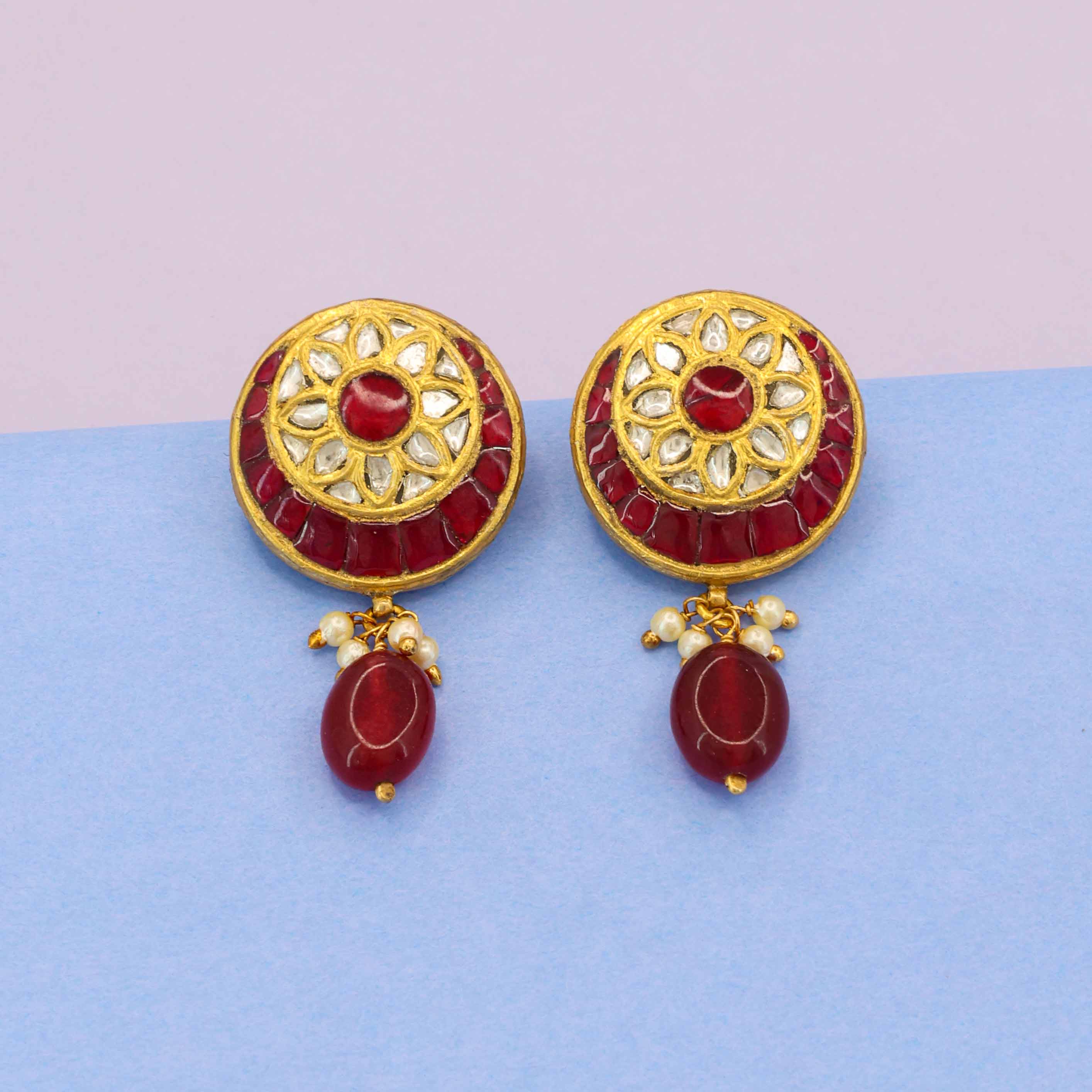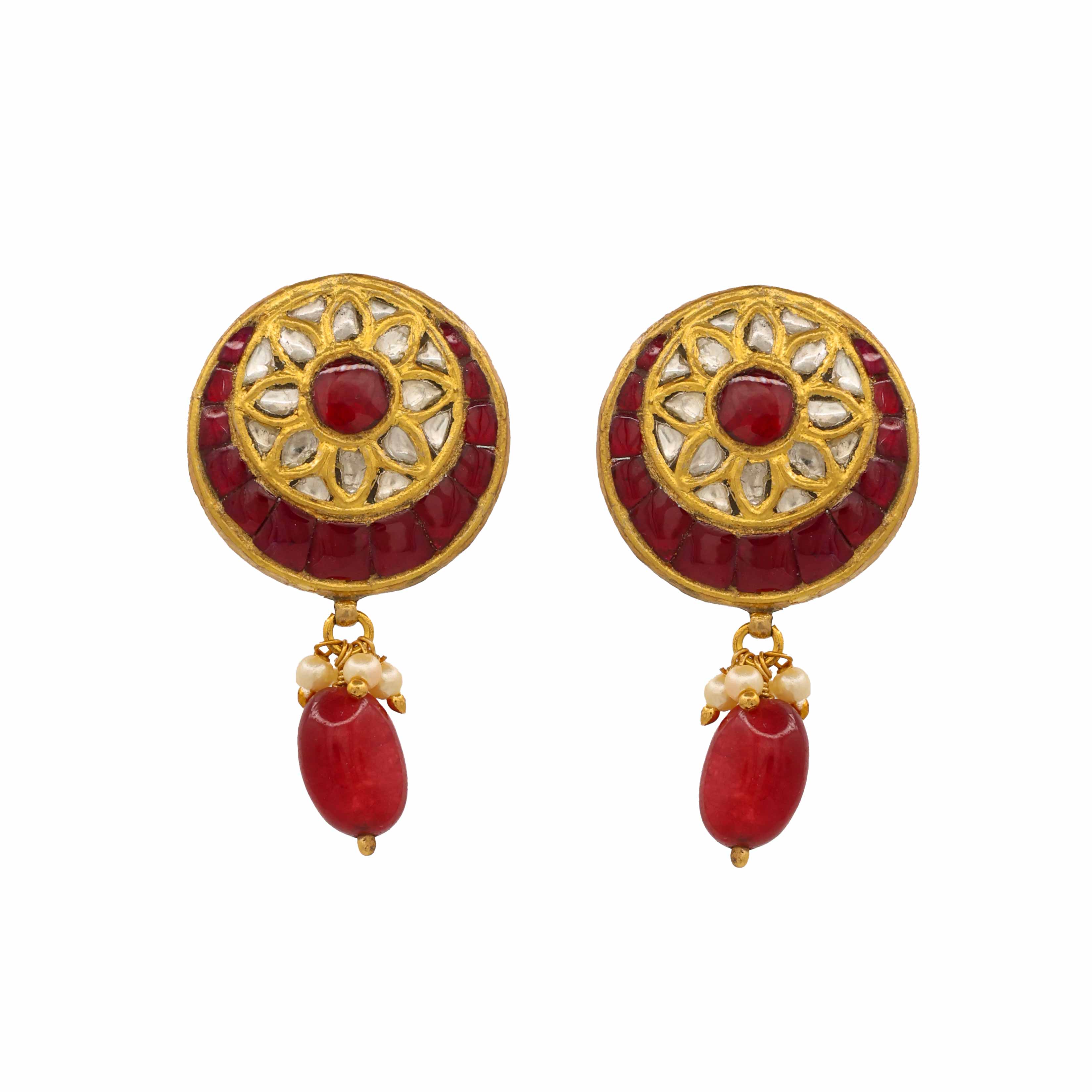 These exquisite earrings feature a round gold design with a striking floral motif. The centerpiece is a Polki diamond, surrounded by glass ruby and intricate gold patterns. The bottom of the earring dangles with a single, lustrous pearl bead, along with smaller glass ruby beads, adding a touch of classic elegance.