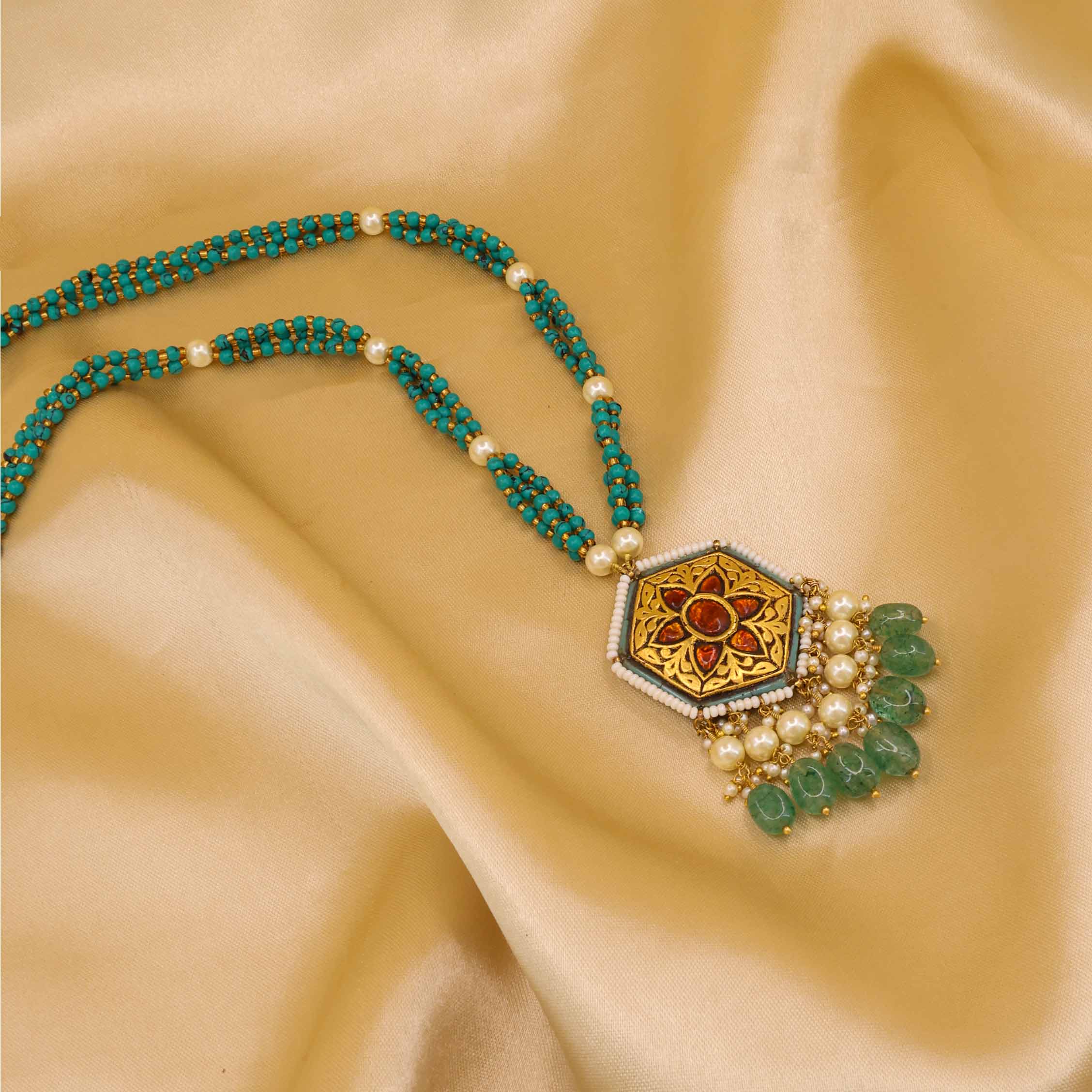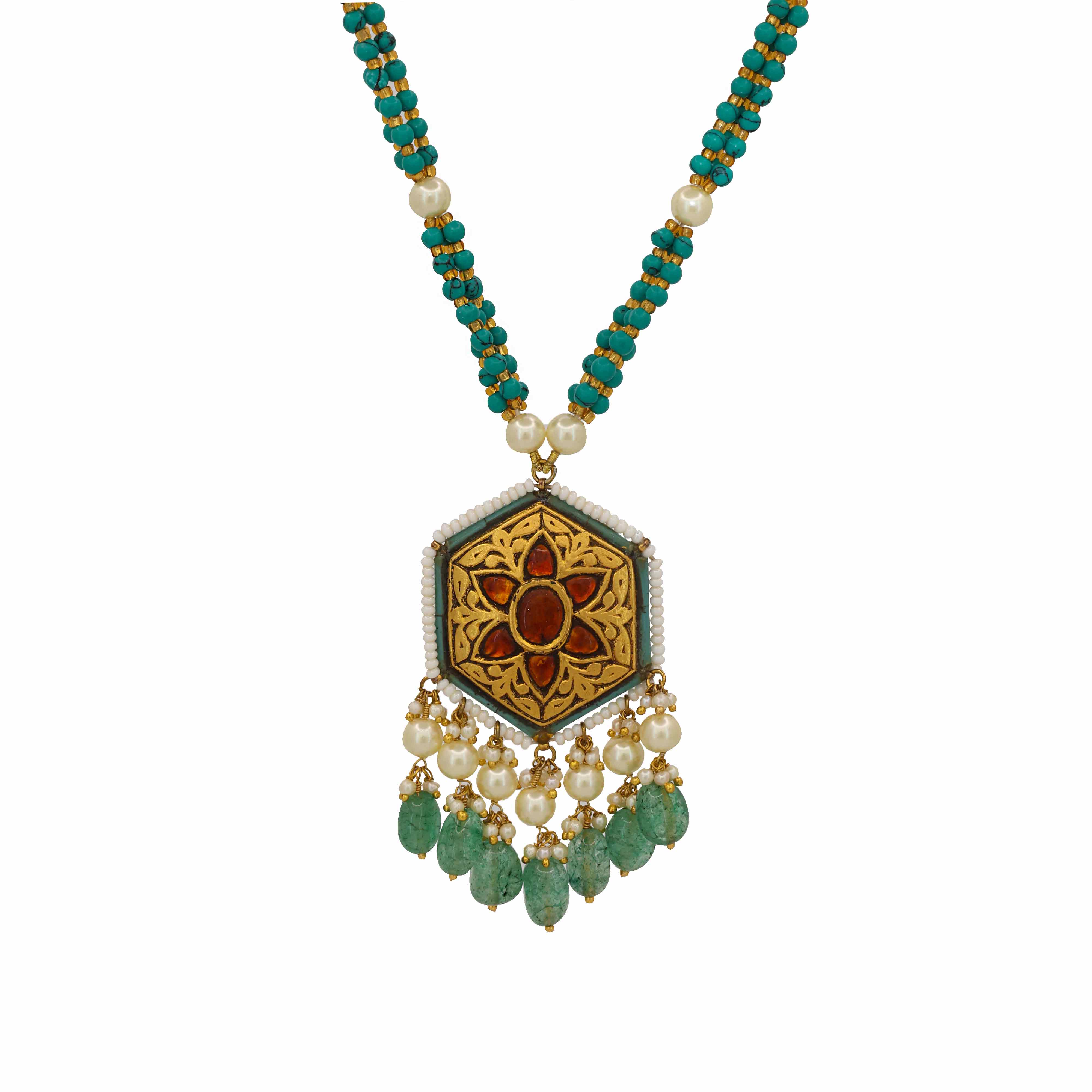 This exquisite gold necklace features a hexagonal pendant with a central garnet stone and intricate gold work. It is surrounded by small pearls and glass emerald beads. The pendant is suspended from a string of polished turquoise and pearl beads, with dangling pearl and glass emerald tassels.