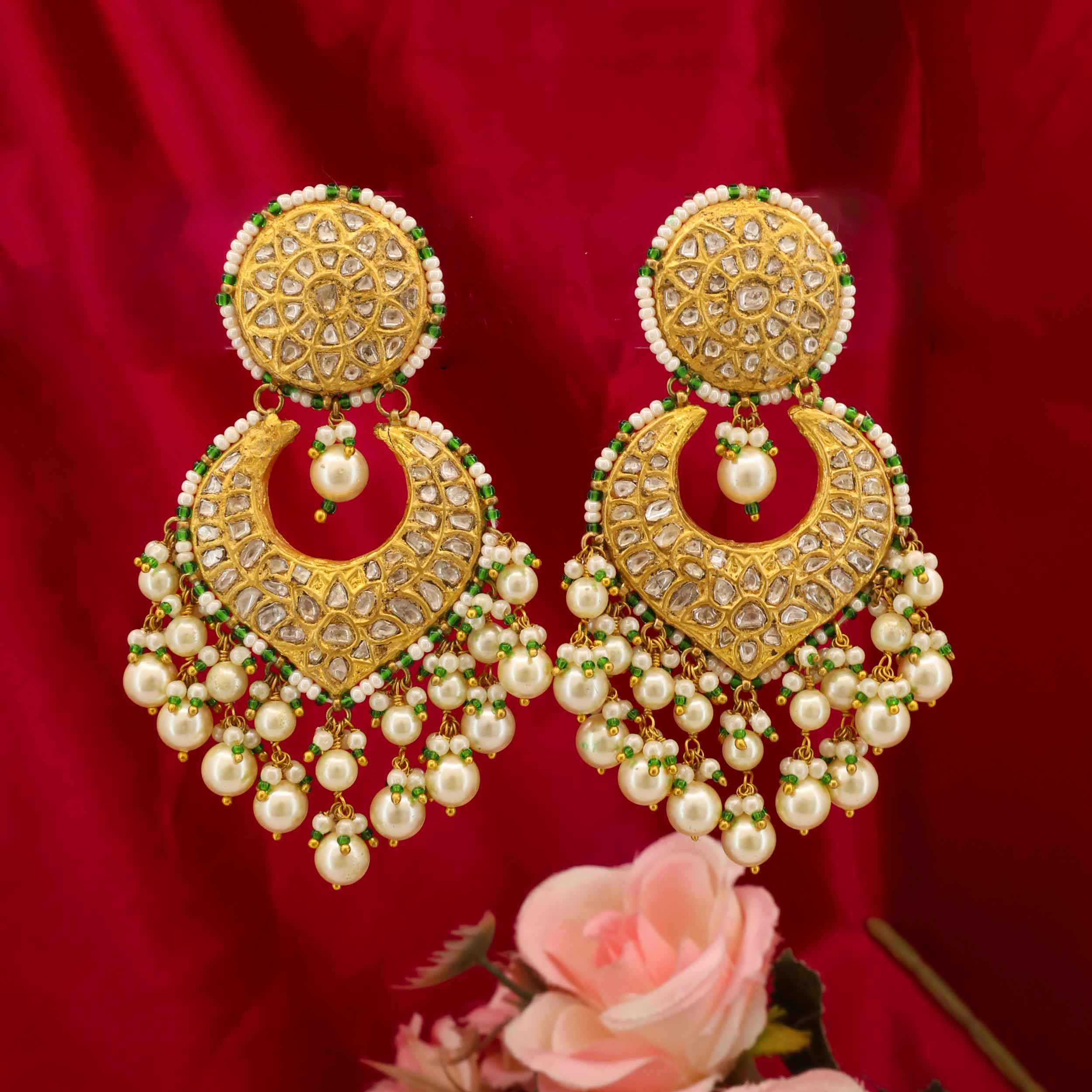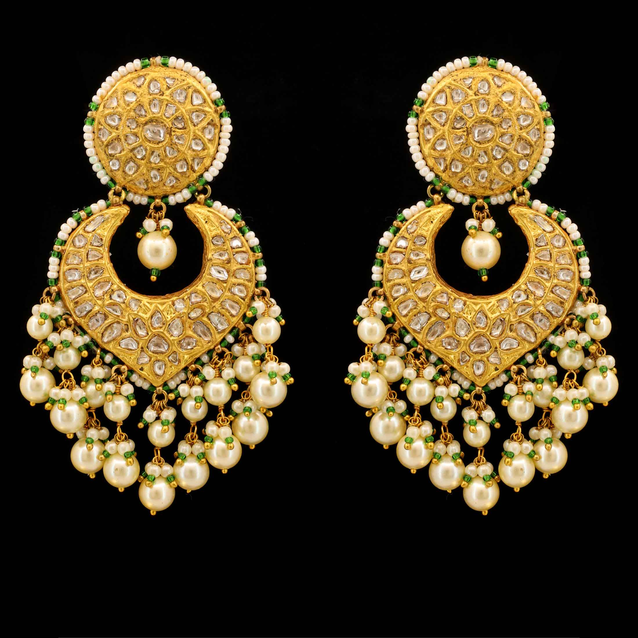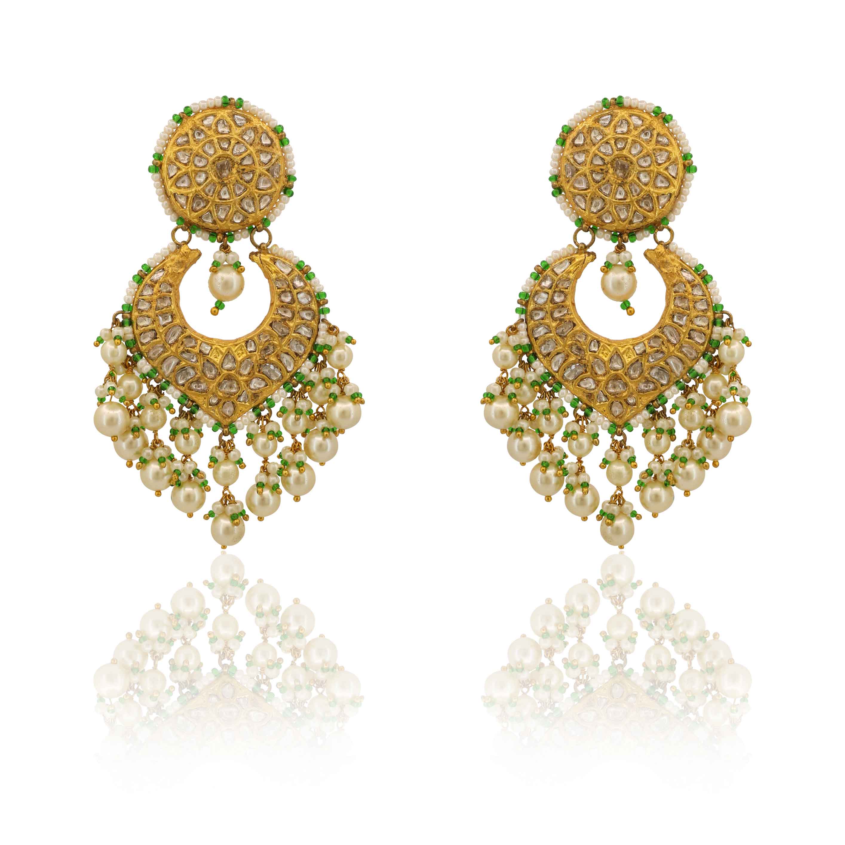 Exquisite and traditional, these Chandbali earrings feature Syndicate Polki in an elegant gold crescent setting. The design is beautifully finished with a shower of lustrous pearl drops and delicate green bead accents. Perfect for wedding festivities or special occasions, they capture a timeless, regal charm.