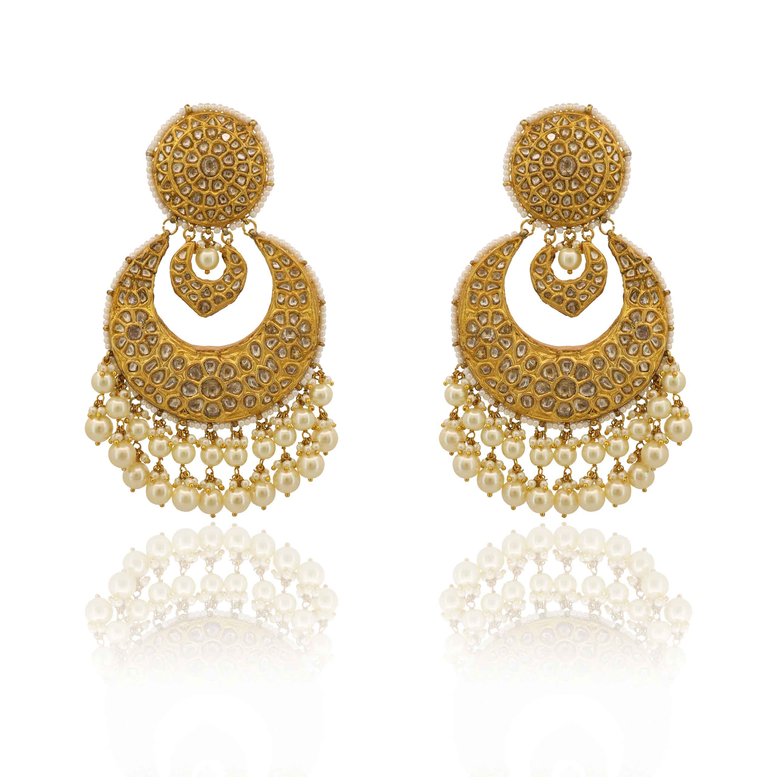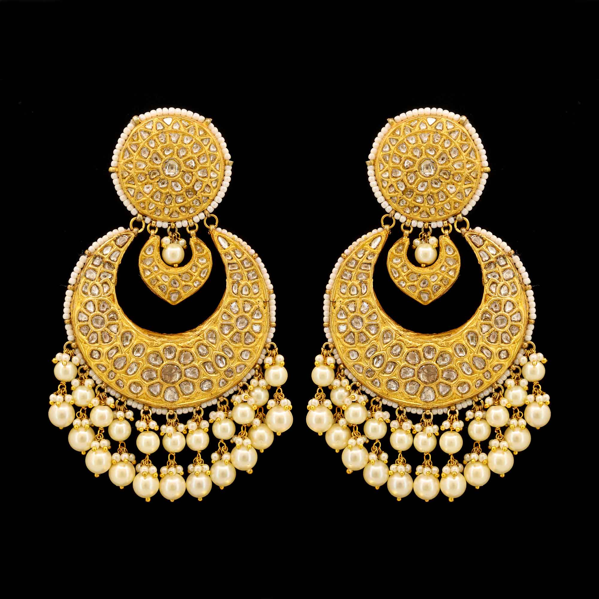 These luxurious Chandbali earrings are a true statement piece. They feature a layered crescent design set entirely with natural Polki diamonds. The rich gold finish is exquisitely completed by a heavy, cascading cluster of lustrous pearl drops, perfect for grand festive or bridal wear.