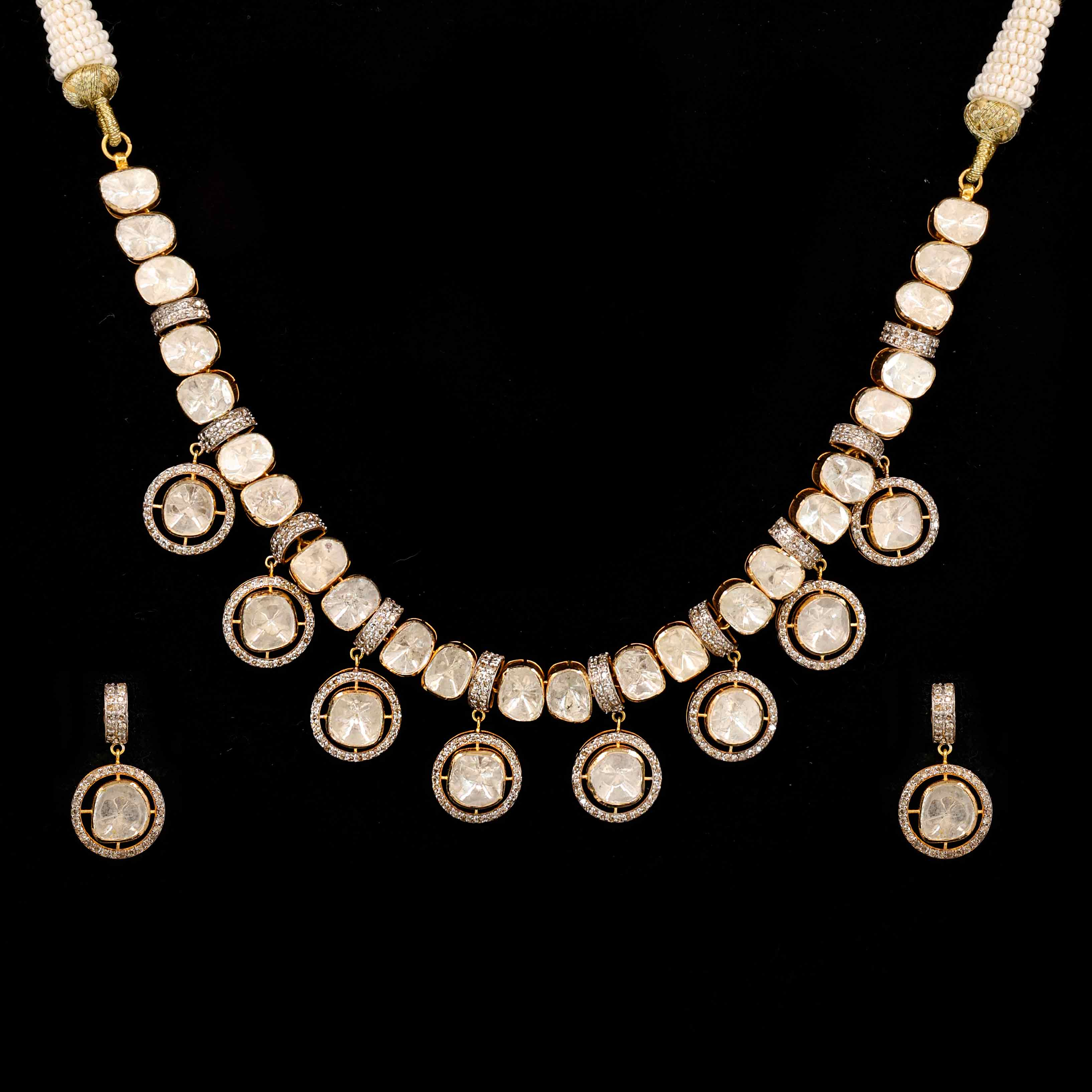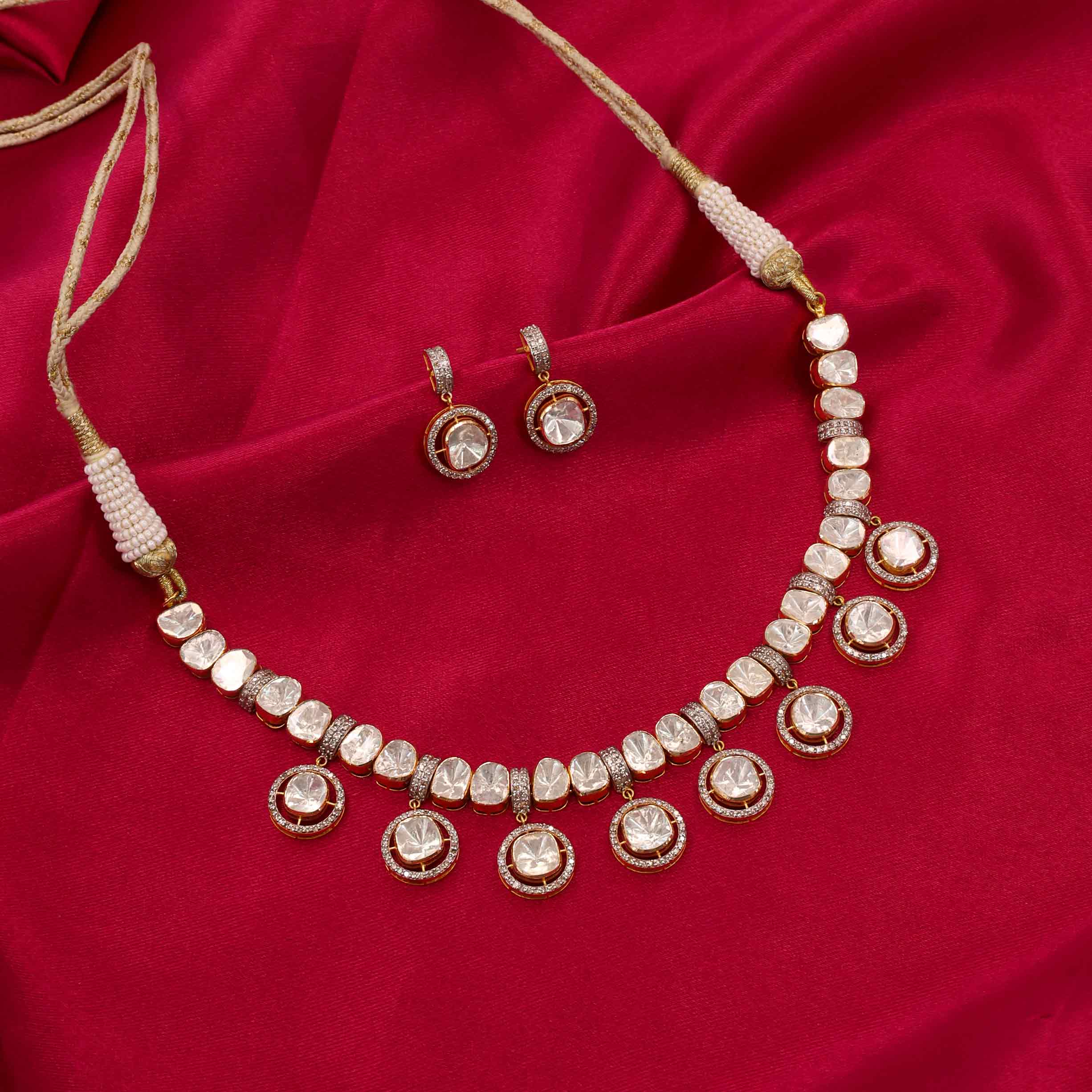 This dazzlingGold Polki Diamond Choker Setfeatures a single row of large, brilliantNatural Polki Diamondsin a traditional closed setting. Dangling below are circularPolki pendantsset in an open setting, framed by smaller diamonds for extra sparkle. Matching earrings complete this elegant, diamond-focused set.