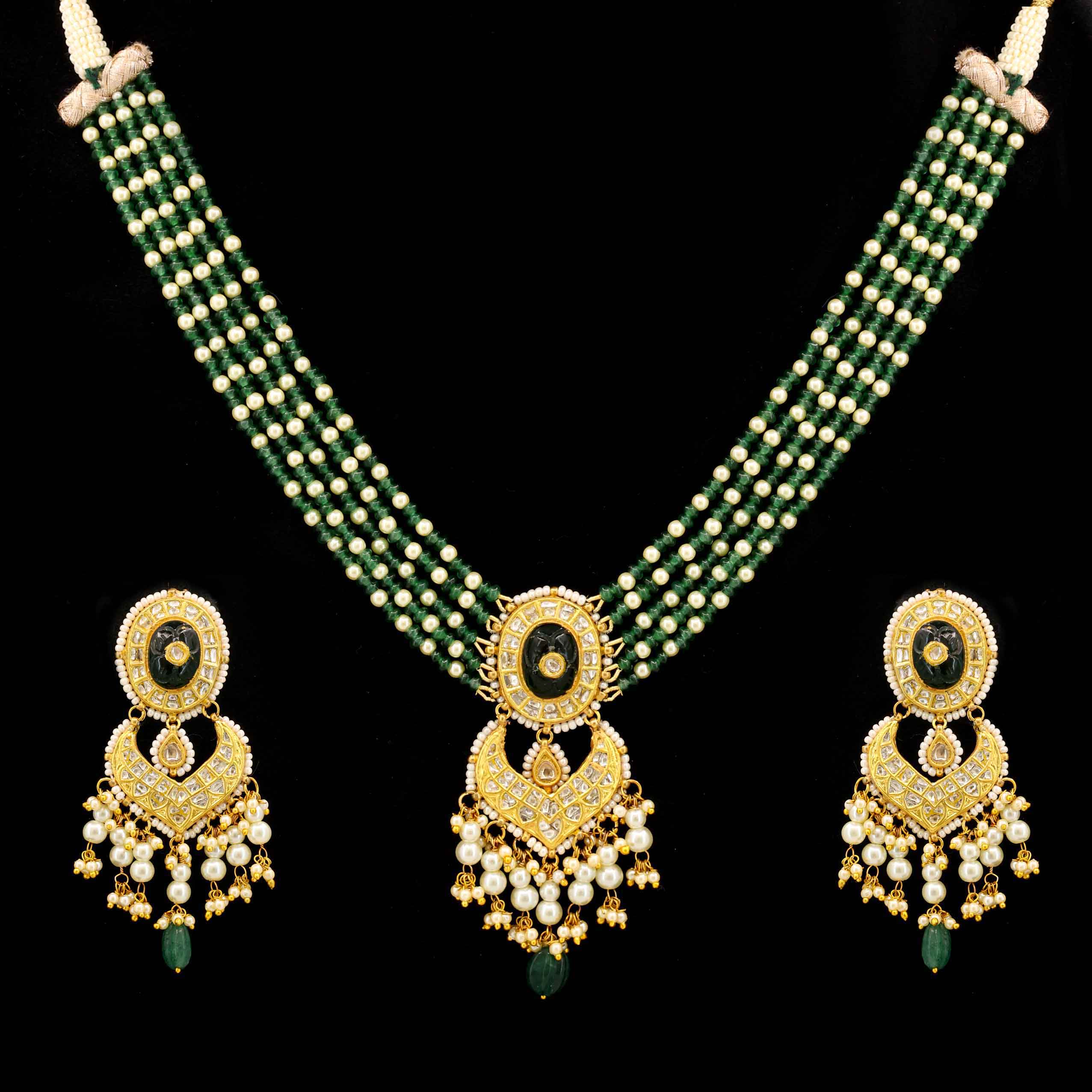 Elegant Jadau necklace set with a central Polki diamond Chandbali pendant. The chain is crafted from multiple strings of emerald beads and pearls.